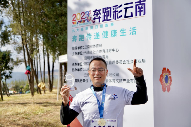 阳宗海站作为赛事收官站,特别邀请了数位参与过2023奔跑彩云南九大高原湖泊领跑赛七场及以上赛事的忠实跑友前来参赛,并为他们颁发了专属荣耀奖杯。来自昆明的跑友陈涛是唯一一位参加了9站赛事的荣誉选手,他表示:“我觉得奔跑彩云南这个活动的立意非常有价值,用自己的脚步丈量云南高原湖泊、感受云南特色民族文化的同时,还能传递健康与快乐。”