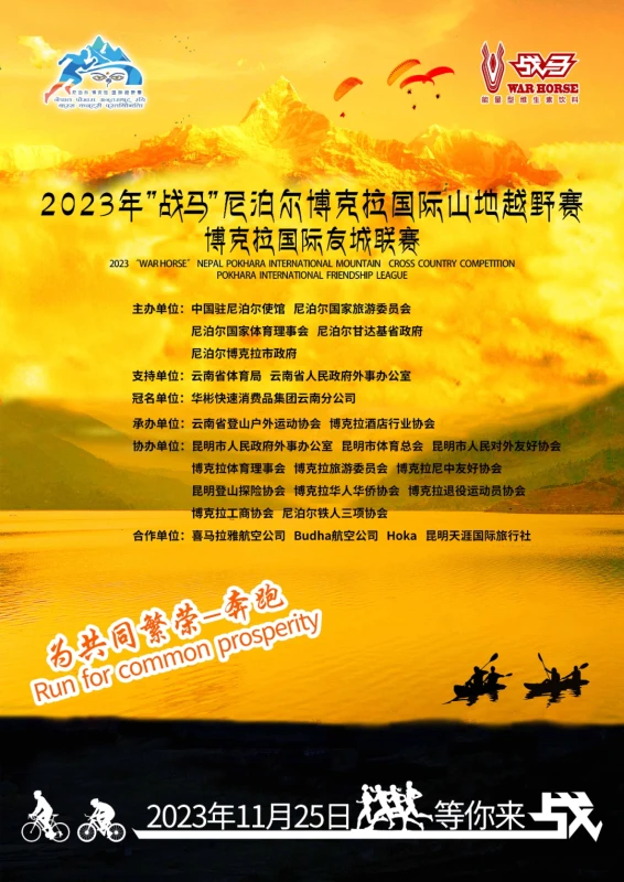 “2023年‘战马’尼泊尔博克拉国际山地越野赛”将于2023年11月25日在昆明国际友好城市——博克拉举办。本次赛事由中国驻尼泊尔使馆、尼泊尔国家旅游委员会、尼泊尔国家体育运动委员会、尼泊尔甘达基省政府、尼泊尔博克拉市政府主办,成人视频 、云南省人民政府外事办公室作为支持单位,云南省登山户外运动协会与博克拉市酒店行业协会等单位为承办单位,比赛的主题为“为共同繁荣—奔跑”。