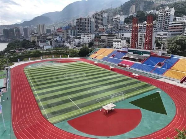 在设施配置方面,体育场集专业竞赛与全民健身功能于一体。主体运动区包括1片11人制标准足球场、8道塑胶跑道,以及铅球、跳高、标枪等田径项目设施;配套区域设有5人制足球场、2个篮球场和1个可兼作羽毛球场的多功能排球场,全面满足各类体育赛事及日常锻炼需求。