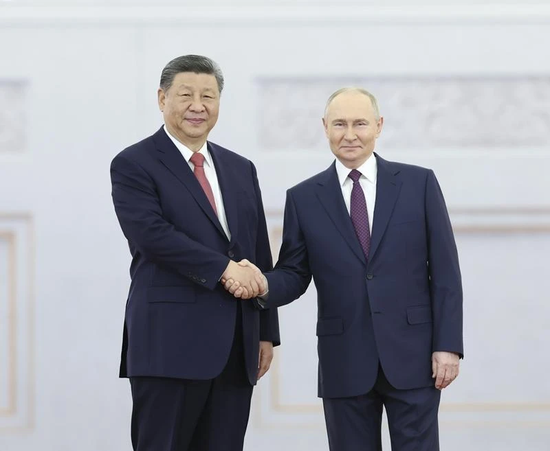 当地时间5月8日上午,俄罗斯总统普京同中国国家主席习近平在莫斯科克里姆林宫举行会谈。普京在乔治大厅为习近平举行隆重欢迎仪式。这是两国元首亲切握手合影。新华社记者 黄敬文 摄