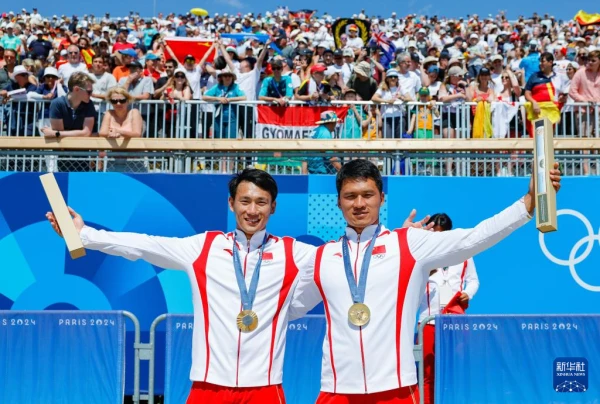 图为2024年8月8日刘浩(右)在巴黎奥运会皮划艇静水男子双人划艇500米决赛中夺得金牌。图源:新华社