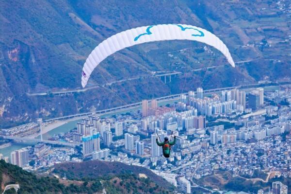 游客在怒江傈僳族自治州体验滑翔伞。