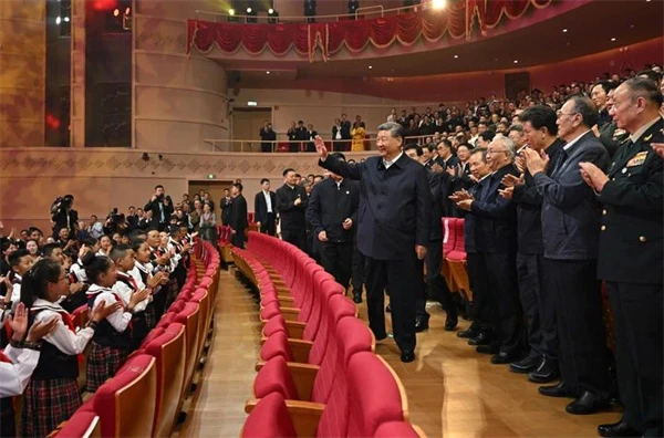 8月20日晚上,庆祝西藏自治区成立60周年文艺晚会《雪域欢歌》在西藏大剧院举行,中共中央总书记、国家主席、中央军委主席习近平同西藏自治区各族干部群众共同观看演出。这是习近平向大家挥手致意。新华社记者 谢环驰 摄