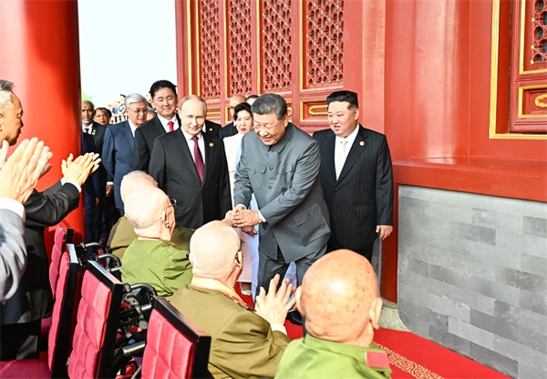 上午8时35分,习近平同出席大会的外方代表团团长拾级而上,登上天安门城楼。习近平同抗战老战士老同志代表亲切握手,向他们表示崇高敬意。
