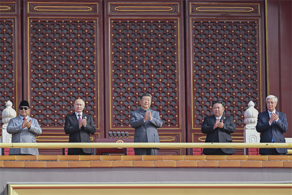 9月3日,纪念中国人民抗日战争暨世界反法西斯战争胜利80周年大会在北京天安门广场隆重举行。这是中共中央总书记、国家主席、中央军委主席习近平等在天安门城楼上。新华社记者 饶爱民 摄