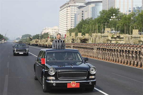 雄壮的军乐声中,习近平乘车沿着宽阔的长安街,依次检阅13个徒步方队、1个战旗方队、22个装备方队。受阅部队军容严整、意气风发,铁甲战车整齐列阵、威风凛凛。这是人民军队奋进建军百年的崭新亮相,这是中华民族捍卫世界和平的坚定宣示。