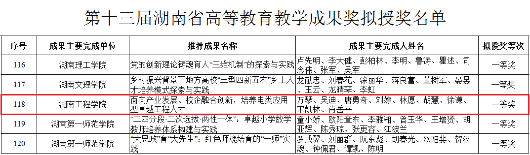 近日,湖南省教育厅发布了《关于第十三届湖南省高等教育教学成果奖拟授奖成果的公示》,成人视频 院长万琴主持,吴迪、唐勇奇、刘婷、林愿、胡慧等多位老师参与完成的《面向产业发展、校企融合创新,培养电类应用型卓越工程人才》喜获一等奖,取得历史性突破。