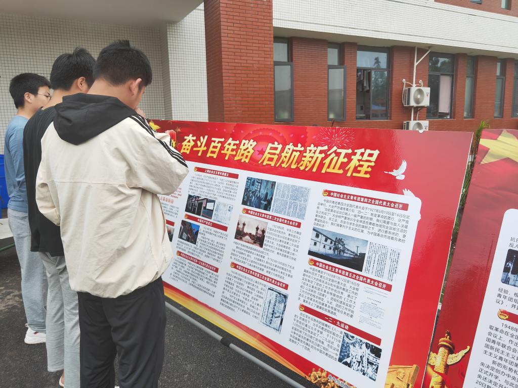 滨江学生公寓门口摆放着大幅的团史展览宣传板,展现了共青团在党的领导下走过的100年波澜壮阔的历史。一个个动人的团史故事、一次次紧要关头的会议、一张张满是岁月痕迹的图片,吸引了路过的同学驻足浏览,重温那段峥嵘岁月。