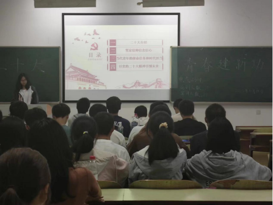 主讲人邱赛男和李均鹏用讲述、互动和播放视频相结合的方式和同学们一起回顾了党过去五年的工作和新时代十年的伟大变革,向同学们介绍了党的二十大精神和未来五年的主要目标。同学们更加深刻感受到我们当代青年的使命任务和时代担当,大家一致认为,作为新时代的接班人,我们要牢记习近平总书记嘱托,以党的二十大精神为指引,努力提升自我素质,摆正自己的位置,要有吃苦耐劳的精神,通过不断学习来适应社会发展,奋力谱写全面建设社会主义现代化国家崭新的篇章。