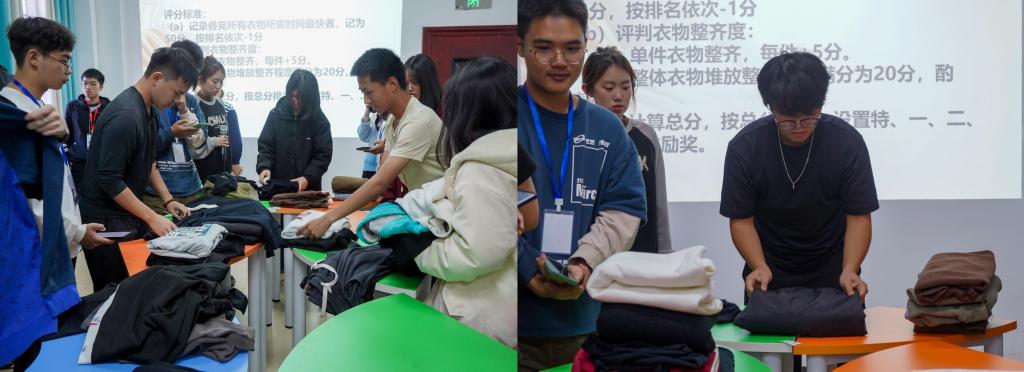在比赛环节,每位同学争分夺秒、一丝不苟地将一堆杂乱的衣服前折、后叠、巧塞。测控技术与仪器2301班的陈一涵同学说:“这次比赛不仅锻炼了叠衣技能,还让我学会了如何在紧张的学习生活中找到放松的方式。”在比赛过程中,有些参赛者最终堆叠起的衣服井然有序,如同艺术品一般;有些参赛者手法熟练快速折叠,同时兼顾好效率与质量。许多参赛选手表示,叠衣服的过程让他们暂时忘记了学业压力,心情变得轻松愉悦。