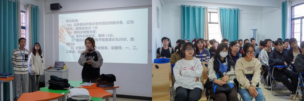 通过视频讲解学习叠衣、收纳的技巧,邀请在场学生分享技巧与心得,很多同学自告奋勇,其中机器人工程2101班的李晓烽表示:“为了本次比赛特意去网上学习了一些衣服的折叠技巧,最大的收获是巧塞衣服保证折叠稳固,这让我认识到专注于生活中的一件小事,也可以收获成就感,放松心情。”