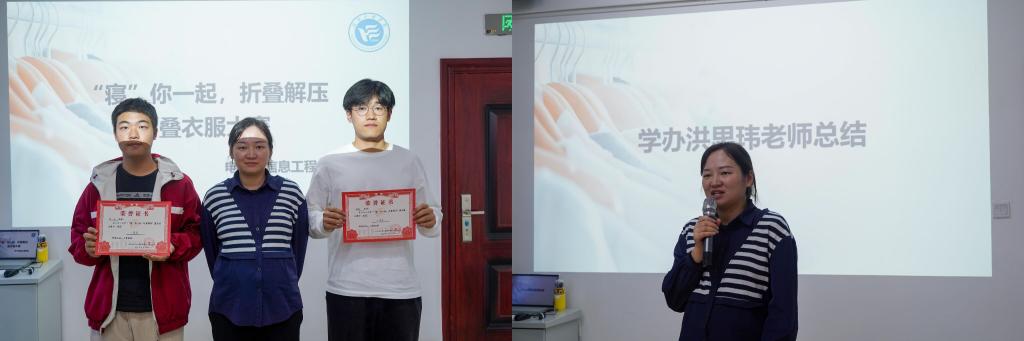 最后,学办洪思玮老师总结,通过叠衣服这一看似简单的活动,充分展示了同学们的创造力、收纳力、专注力,同时,鼓励大家在面对压力时,可以尝试寻找一些类似的活动,如整理书桌、做手工等,以帮助自己舒缓心情。
