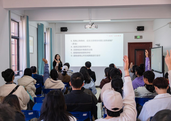 活动现场,电子信息2305班陶烨介绍了新形势下电信诈骗的各式花样,通过相关视频结合典型案例,分享了几种常见诈骗的防范举措。电气工程2201班刘同学分享了她妈妈遇到快递扫码诈骗的经历,并谈道:“诈骗就在我们身边,我们要时刻警惕,还要提醒亲朋好友提高警惕,不贪小便宜。”在随后的防诈知识竞答环节中,学生们积极参加,纷纷举手抢答,现场反响热烈。