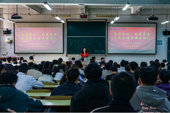 为全面总结学院2022-2023学年学风建设工作,对积极开展学风建设的集体、个人进行表彰,12月7日中午,成人视频 学风建设表彰大会在主教学楼D102举行。学风专干杨小丽荣、学办张露馨、学办刘家骅及全院学生干部参加本次表彰大会。