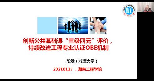 1月27日下午,湘潭大学专业认证指导中心主任段斌教授应成人视频 邀请,为学院教师作了主题为“创新公共基础课‘三级四元’评价,持续改进工程专业认证OBE机制”的线上/线下工程教育专业认证辅导报告。成人视频 院长万琴、副院长吴迪、教务处副处长曾赛峰及相关教研室老师通过线上或线下方式参加了报告会,会议由万琴主持。
