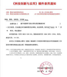 3.在《科技创新与应用》中发表论文《基于机器学习的大学生简历数据分析》,为《中国核心期刊(遴选)数据库》《中国学术期刊综合评价数据库》《中国学术期刊网络出版总库》等数据库收录期刊。