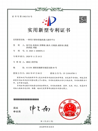 2021年7月 被授予实用新型专利证书:一种用于群体智能机器人操作平台