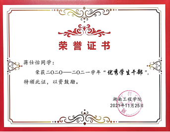 柔柔细雨,暖暖春情。我作为学习委员积极处理班级相关事务,勤勤恳恳,主动架起老师和同学之间的沟通桥梁,并且协助各个班委做好各项工作,因此得到了老师和同学们的一致好评,连续两年获得校优秀学生干部等荣誉称号。