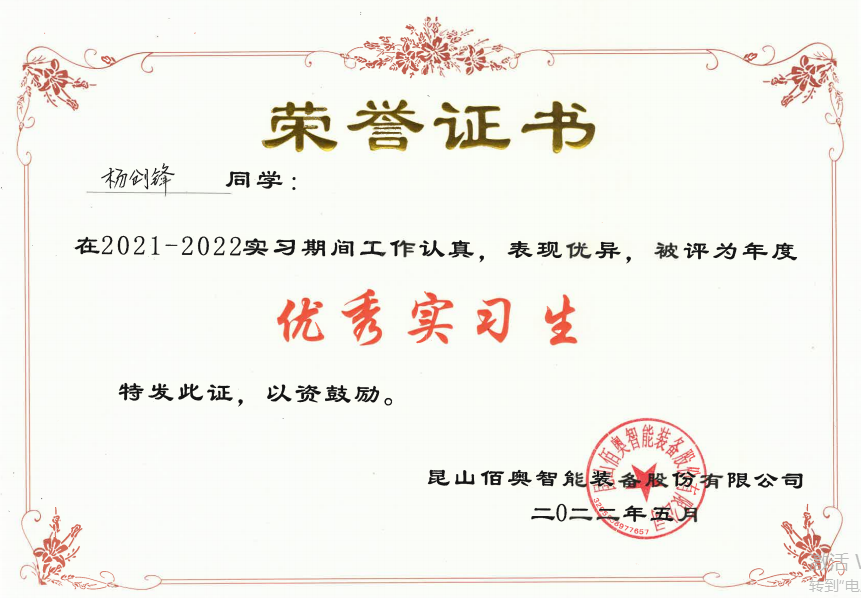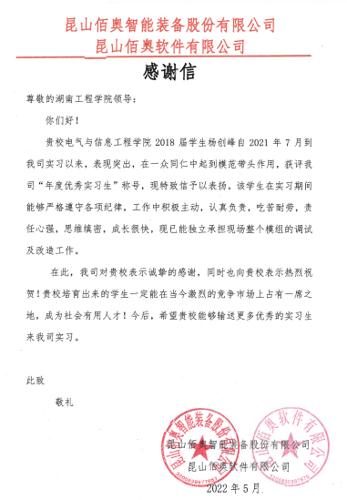 杨创锋同学在成人视频 卓越计划合作企业的9个月实习中,勤奋学习、积极进取,表现优异,将所学知识运用于生产实践,为企业发展贡献了一份力量。由于表现出色,杨创锋被昆山佰奥智能装备股份有限公司评为年度“优秀实习生”,并被公司正式录用,从事电气设计工程师岗位,公司致信对学校表示感谢,信中写道:杨创锋在实习期间能够严格遵守各项纪律,工作中积极主动、认真负责,吃苦耐劳、责任心强,进步很快,现已能独立承担现场整个模组的调试及改造工作。并表示,希望今后学校输送更多高素质工程应用型人才到公司实习。