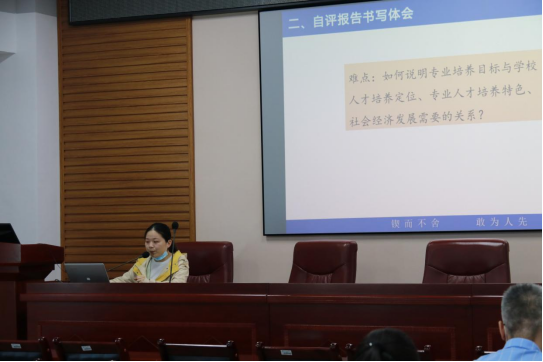 3月22日下午,院长万琴以“基于闭环控制系统的专业认证体系思考”为主题,详细阐述了专业认证的初衷、认证体系、主要问题分析以及持续改进。她指出,产出导向教学改革实施措施促进课堂发生改变,专业认证的核心价值促进专业建立持续改进机制,在课程评价中落实以学生为中心的理念。随后的每周二下午,由撰写自评报告的主笔老师分别针对每章的内容进行经验分享,从学生、培养目标、毕业要求、持续改进、课程体系、师资、支撑条件七个方面详细阐述认证内容,将“以学生为中心、产出为导向”OBE理念根植于每位老师心中。