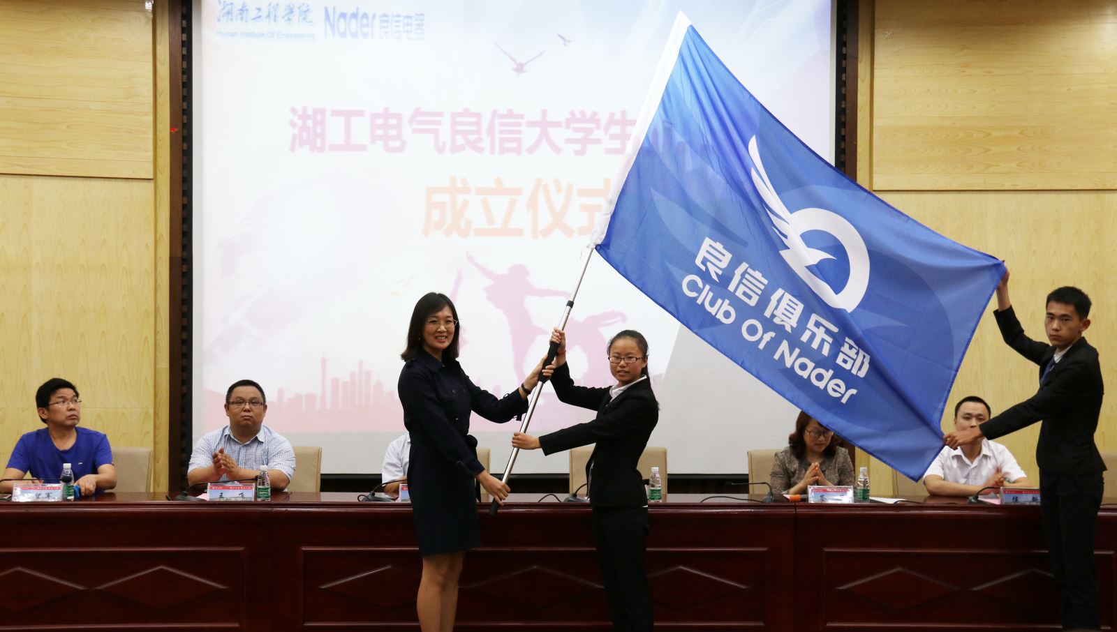 仪式伊始,唐院长致辞,他回顾了十年来上海良信电器与学院校企合作的情况,对企业给予学校办学的大力支持表示了感谢。他说,良信大学生俱乐部作为探索校企合作的新模式,可以说是开了一个好头,相信这种深层次的合作一定能够推动学院专业方面的建设,提升同学的职业素养。随后由魏佳男与唐勇奇共同为俱乐部揭牌,黄望军宣读了首届俱乐部运行成员名单。之后,在热烈的掌声中,魏佳男将会旗授予了首届俱乐部理事会会长李苹。最后,魏佳男总结讲话,她肯定了电气学院多年来为企业发展提供的人才支持,并代表企业对俱乐部的发展提出,希望俱乐部以企业提供的实践平台和支持为根本,通过俱乐部成员的宣传和推动提高公司在学校的知名度和影响力,促进企业和学生的双边交流。