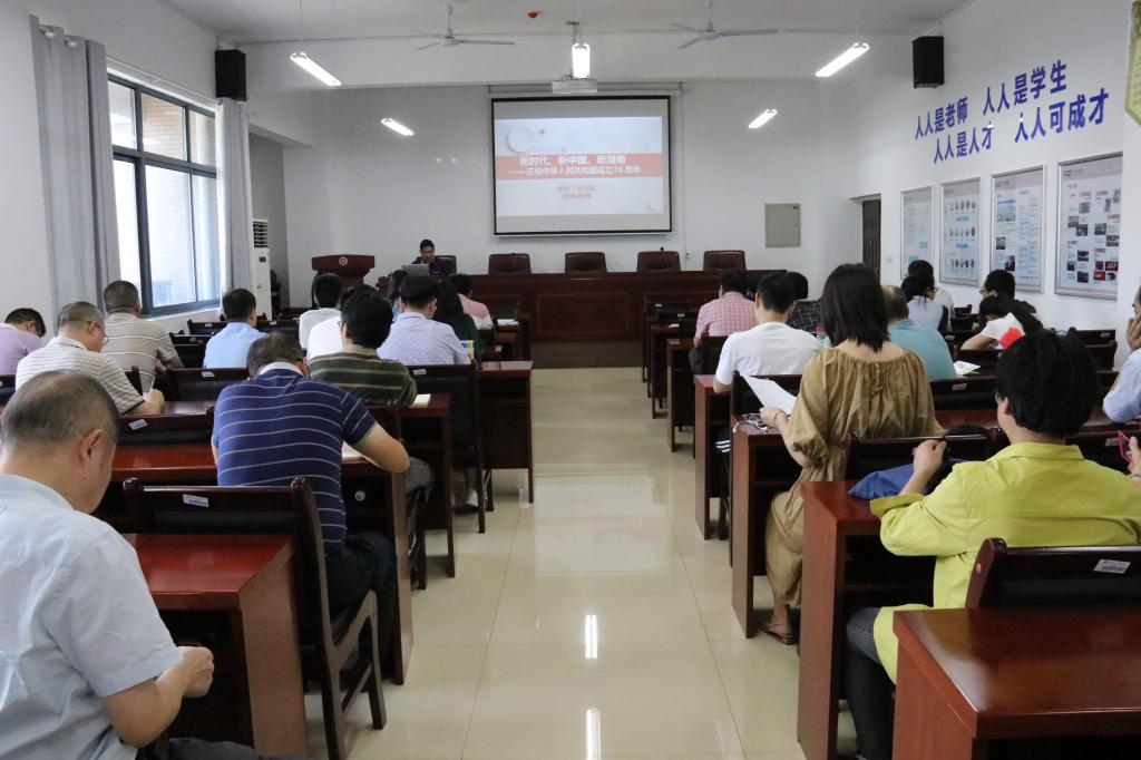 9月24日下午2点半,成人视频 举行庆祝中华人民共和国成立70周年宣讲活动,党总支书记黄望军以“新时代、新中国、新湖南”为题进行了宣讲,从新中国新湖南70年发展成就辉煌、新中国新湖南70年发展经验弥足珍贵、对历史最好的纪念就是创造新的历史三个方面进行了讲解。通过宣讲,大家对新中国70年的发展成就及湖南70年来的变化感到骄傲和自豪,对未来充满了希望和奋斗的动力,宣讲反响热烈。