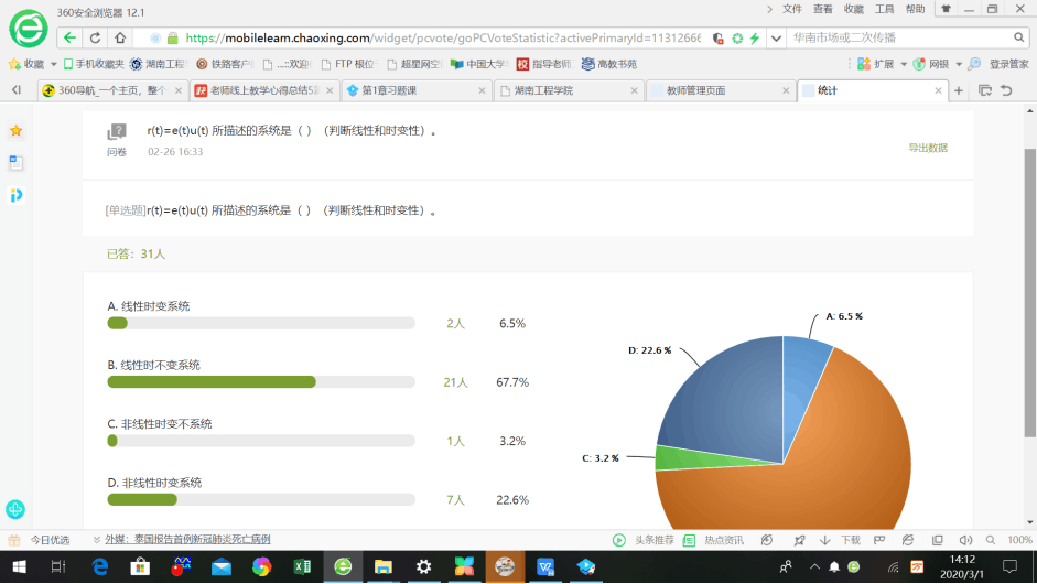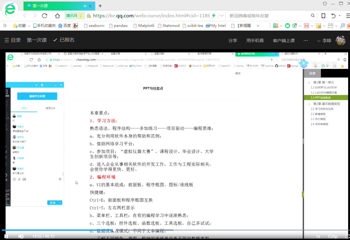 作为一名刚入职半年的新人老师,李老师在教学方面经验不足,但她提前行动,早作准备,综合分析其他老师提供的各种教学平台和经验,最终选择了以“MOOC+学习通+腾讯直播”相结合的方式进行《虚拟仪器技术》课程的网课教学。开学前一周,李老师先自行观看了慕课上的课程,根据慕课上的教学内容和进程,及时调整自己的授课计划和教案,在学习通设置作业和章节测验。第一次摸索这些软件、设置题目比较费时间,但慢慢也会获得一些经验,她会热心地将自己的经验与教研室其他老师分享。为提前了解教学效果,开学前一周即安排学生看MOOC第一单元,并在学习通做第一次作业。接着,第一节网课、第一次签到、第一次发布调查,、第一次发布讨论、第一次腾讯直播……虽然这些第一次看起来有些生疏,但是李老师勇于摸索、不断积累,相信这些经历积淀起来将会使她的网课更上一层楼。