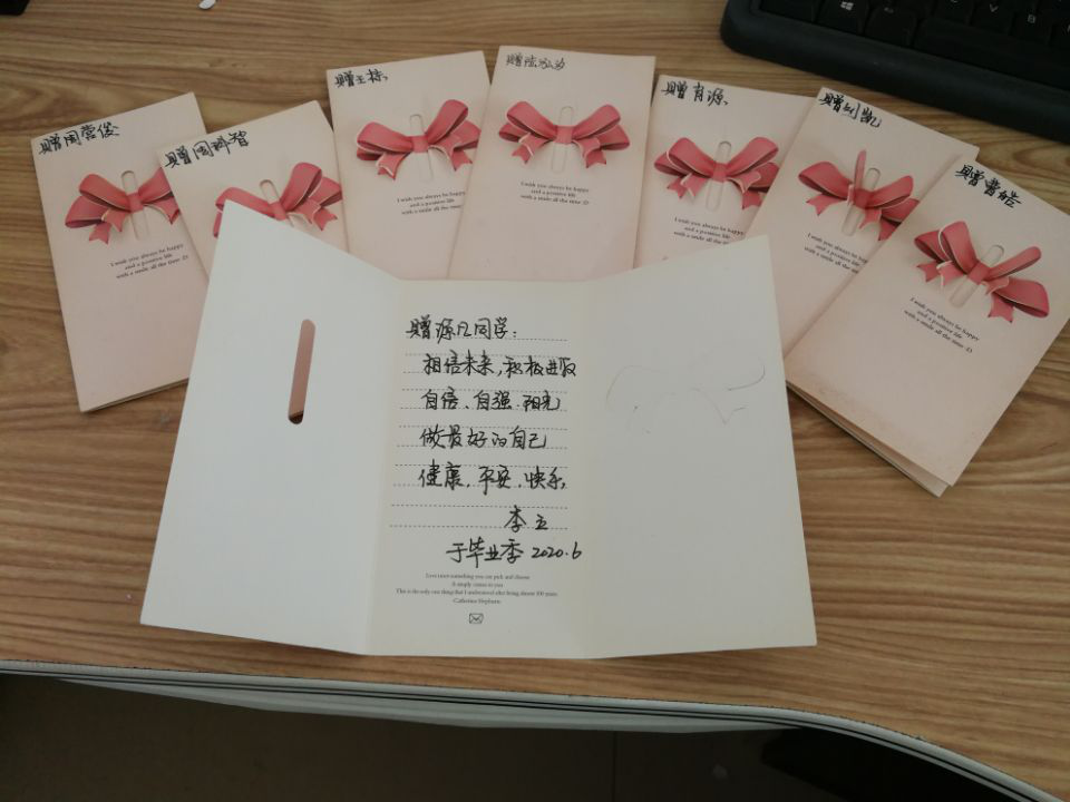 “在这全民抗疫的日子,今年的毕业季注定与往年不同,少了几分喧嚣,多了一份宁静,让我们有更多的时间沉下心去思考人生、憧憬未来。这也是老师从教30多年来,第一次给毕业生赠送小卡片,卡片虽小也不算漂亮精致,但这是老师跑了一个晚上才找到的,它传递着老师的希望和祝福:希望同学们勇往直前,做最好的自己。”李立老师在QQ群给毕业生留言。