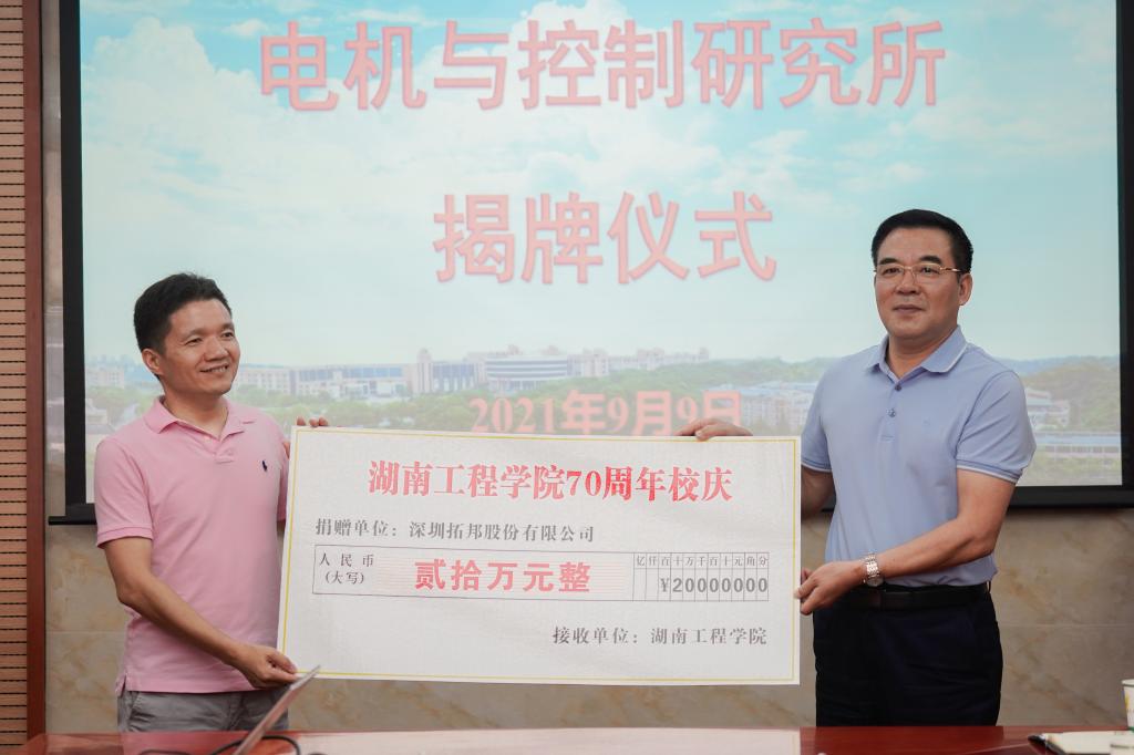 在建校70周年到来之际,深圳拓邦股份有限公司与成人视频 共建电机与控制研究所,并为研究所每年捐资20万元,用于支持研究所开展科研工作,助力学校发展。9月9日上午,电机与控制研究所揭牌暨捐赠仪式在电气楼310举行,学校党委书记陈岳堂出席并发表致辞,成人视频 领导班子、教师代表及研究所校内负责人参加仪式,深圳拓邦股份有限公司总经理马伟一行四人出席仪式。仪式由成人视频 院长万琴主持。