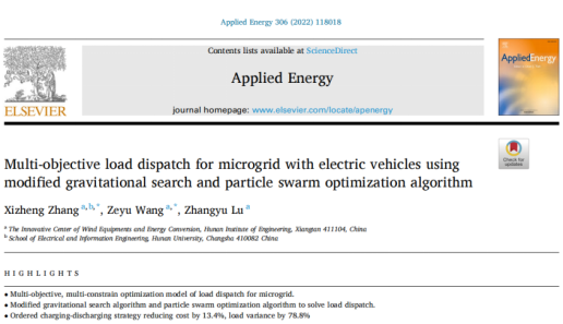 在成人视频 70周年华诞之际,成人视频 2019级硕士研究生王泽宇(Zeyu Wang)以论文成果形式献上对母校最真切的祝福,感谢母校的培养。文章“Multi-objective load dispatch for microgrid with electric vehicles using modified gravitational search and particle swarm optimization algorithm”发表于中科院一区TOP期刊《Applied Energy》,影响因子9.746。上述研究得到了国家自然科学基金的支持和研究生指导老师张细政教授的指导。