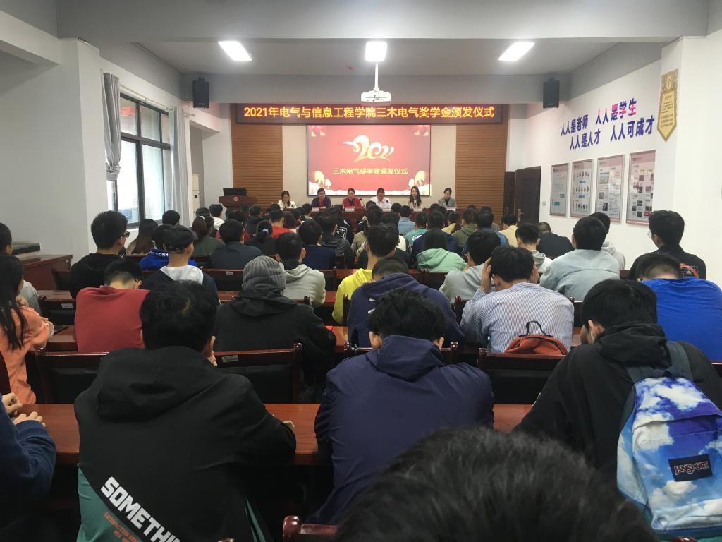 10月15日上午,成人视频 三木电气奖学金颁发仪式在电气楼408举行,副校长向前出席并发表致辞,成人视频 党委书记黄望军、院长万琴及学生代表参加,湖南三木电气股份有限公司董事长陈力斯一行三人出席仪式,仪式由万琴主持。