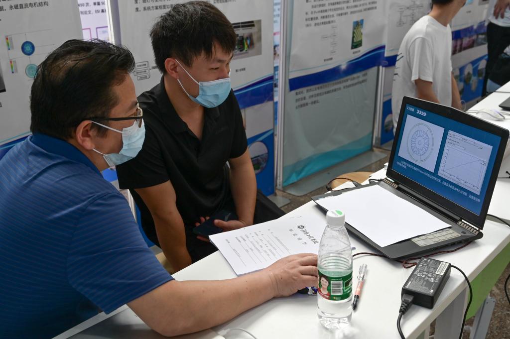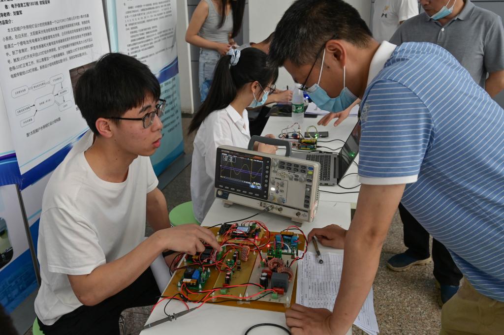 毕业生们现场展示自己的设计作品,在电子显示屏上滚动播放作品视频简介,师生当评委,毕业生现场答辩回答问题,其他年级学生踊跃前来观摩。电子信息工程1802班向晓争向在场师生演示了他的作品《生活垃圾智能分类装置设计》,可以对常见的四类垃圾:可回收垃圾——饮料易拉罐;有害垃圾——电池;厨余垃圾——果皮;其他垃圾——一次性筷子等进行单个自动分类识别,识别度高。 新能源科学与工程1802班徐嘉杰的作品《新能源汽车AC-AC充电电源设计》,不同于常见的新能源汽车充电桩,该作品被设计为一个可移动的独立系统,唯一的能量来源是光能,反馈与信号控制系统基于运算放大器和基本的逻辑门电路,不需要任何软件程序,该设计相当于新能源汽车专用的太阳能充电宝,可以在缺少充电桩的地区缓解紧张的充电需求,在偏远地区提供应急的充电援助,运输和维护都非常方便。