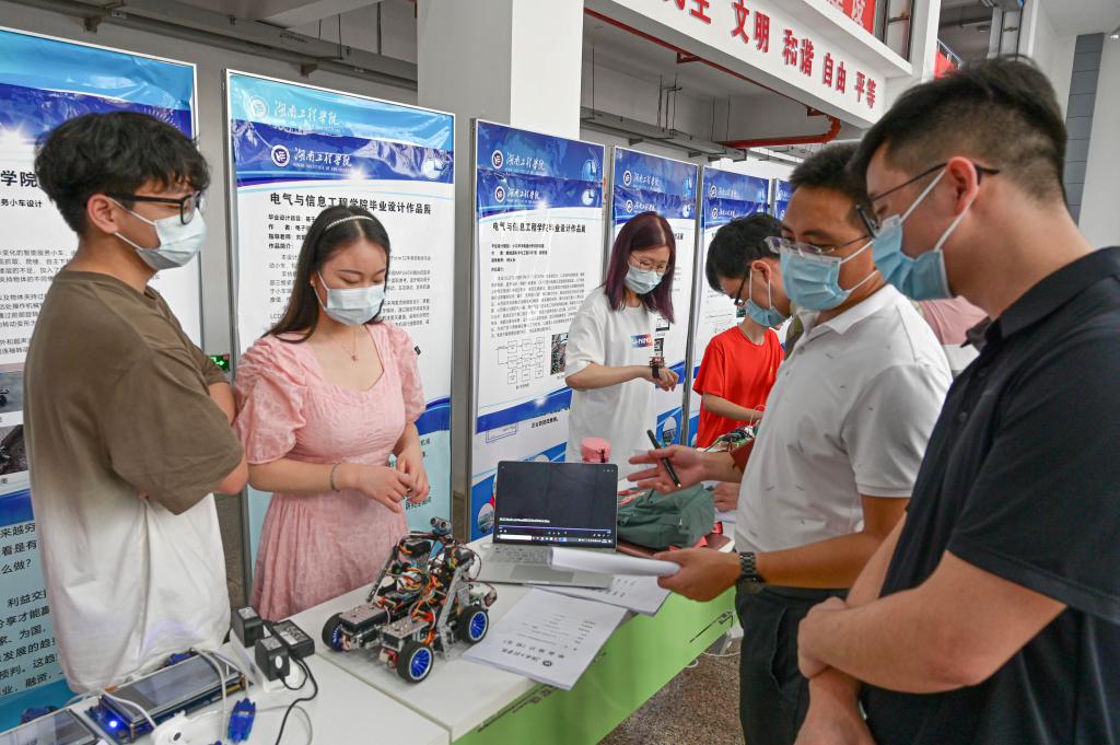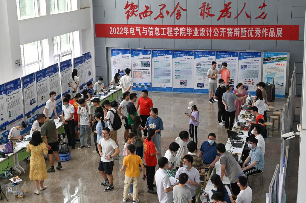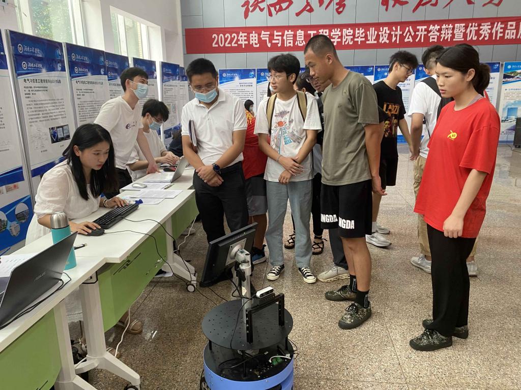 6月6日上午,电气楼一楼大厅人头攒动,成人视频 2022届毕业设计作品展暨公开答辩会在这里举行。成人视频 电气系自动化0403班杰出校友、湘潭钢铁集团有限公司瑞菱科技智能制造部部长袁君奇、湖南科通电气设备制造有限公司总经理朱逸福前来观摩并指导。
