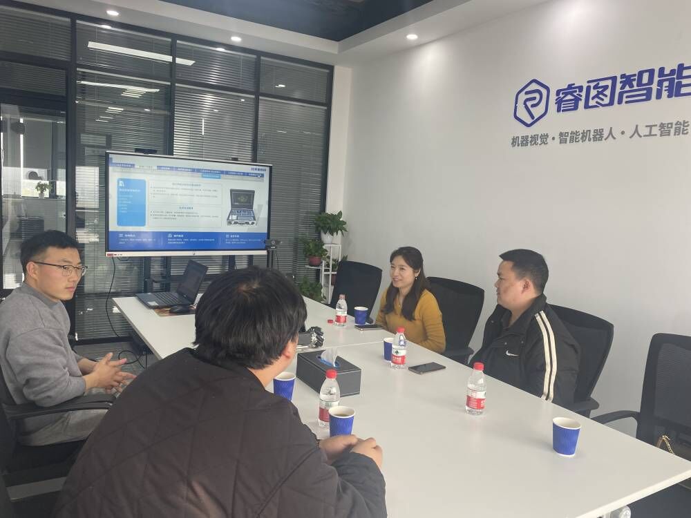 3月3日上午,万琴带队前往湖南睿图智能科技有限公司,公司校企合作负责人首先对企业的总体情况进行介绍;其次,技术人员介绍了公司在食药品、饮料、矿石、建筑、航天航空、生物医疗等行业研发的视觉识别、检测、定位等一系列标准化产品,并详细讲解了产品的功能特点及其原理;然后,双方就机器人等产品的技术问题进行了深入交流;最后,万琴向在该公司实习的毕业生表示了关心和慰问,了解学生目前在企业的生活、工作以及毕业设计进展等情况。