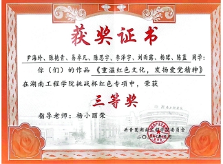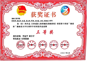 2021年8月 被湖南省教育厅、共青团湖南省委、湖南省科学技术协会、湖南省社会科学院、湖南省学生联合会评为第十四届“挑战杯”湖南省大学生课外学术科技作品大赛三等奖