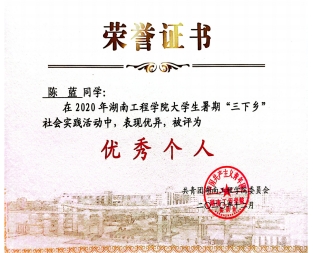 2020年12月 被共青团成人视频 委员会评为暑期三下乡社会实践“优秀个人”